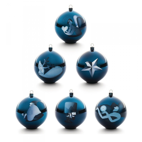 Realizzata in vetro soffiato decorato a mano su base blu specchiata, ogni palla raffigura un diverso personaggio, protagonista del magico mondo fiabesco della collezione Blue Christmas: